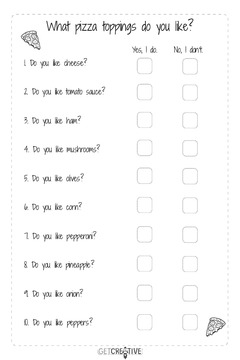 Zadaniem uczniów jest odpowiedzieć na pytania dotyczące pizzy.