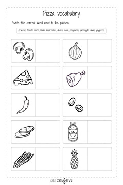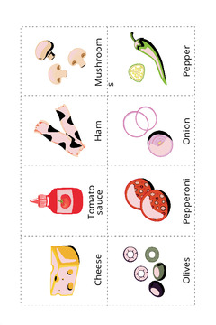 Słownictwo, które warto omówić: cheese, tomato sauce, ham, mushrooms, olives, corn, pepperoni, pineapple, onion, peppers.