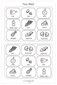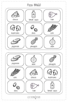 Plansze do gry bingo ćwiczące słownictwo związane z pizzą.