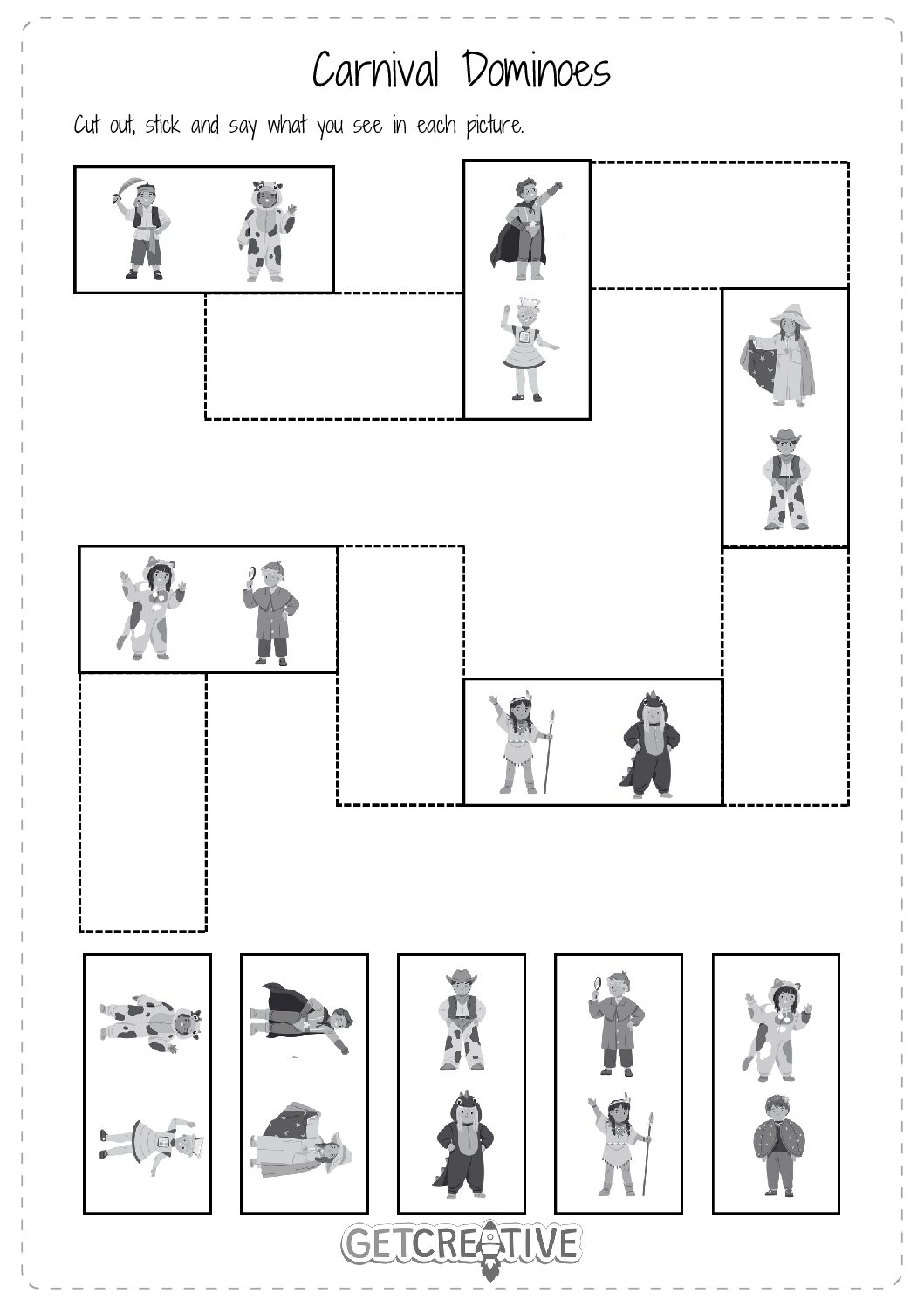 Karty obrazkowe przedstawiają kostiumy karnawałowe.
