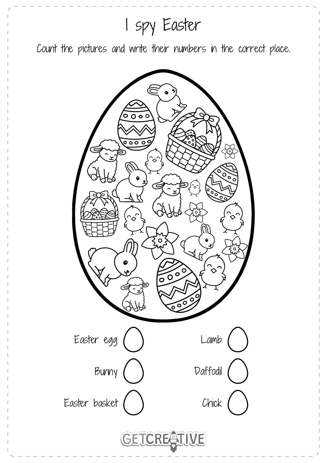 Karta pracy do powtórzenia słownictwa związanego z Wielkanocą. Zadanie polega na policzeniu obraz...