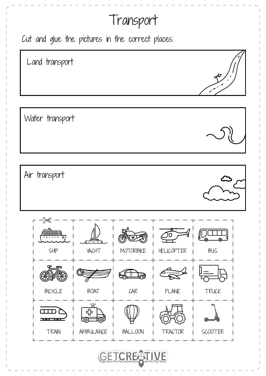 Zadanie polega na wycięciu i przyklejeniu rysunków przedstawiaących środki transportu, w o...