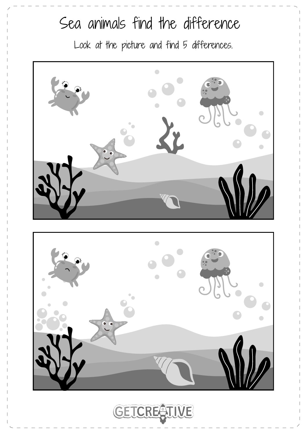 Zadanie polega na odnalezieniu różnic między obrazkami przedstawiającymi zwierzęta morskie.