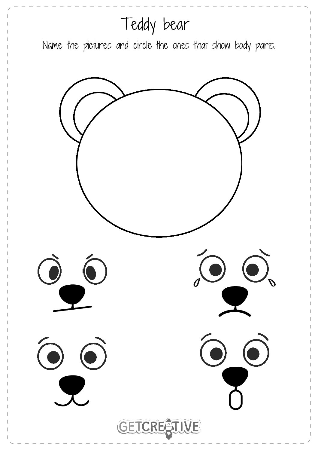 Karta pracy z buzią misia i różnymi minami do wycięcia i ćwiczenia nazw emocji.